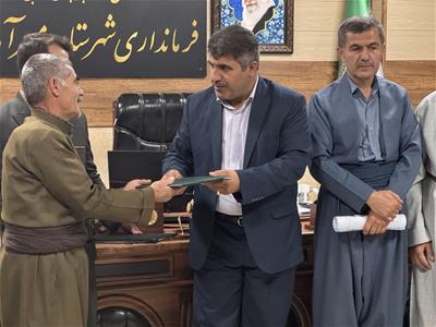 اهدای احکام مستمری بازنشستگان صندوق بیمه اجتماعی روستاییان و عشایر در فرمانداری میرآباد