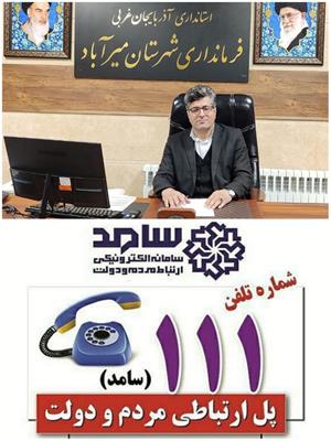 هم شهرستانی هاى عزیز می توانند براى ارتباط مستقیم با سرپرست فرمانداری میرآباد روز چهار شنبه 22 اسفند ماه از ساعت 11 الی 12 صبح با شماره 111 (سامد) تماس و با ایشان گفتوگو نمایند