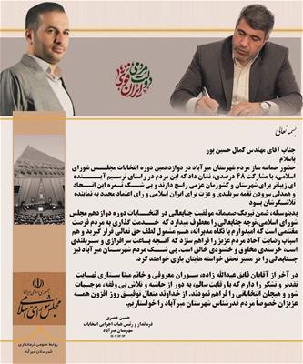 پیام تبریک فرماندار شهرستان میرآباد به نماینده منتخب مردم شهرستان های پیرانشهر، میرآباد و سردشت در مجلس شورای اسلامی